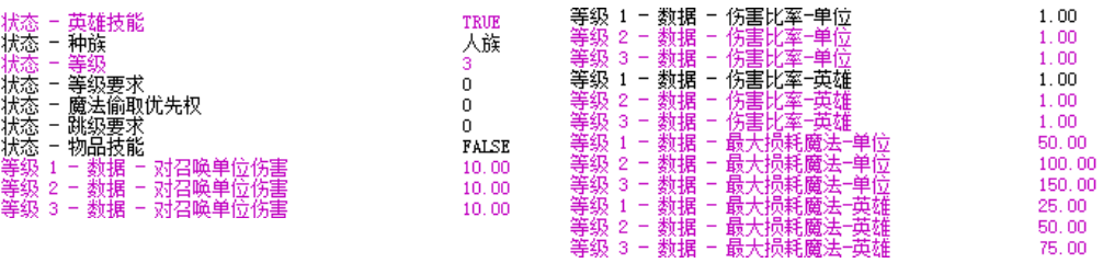 魔法免疫 | 使单位获得魔法免疫状态。 | 一级即可完全魔免,无需设计多级 |