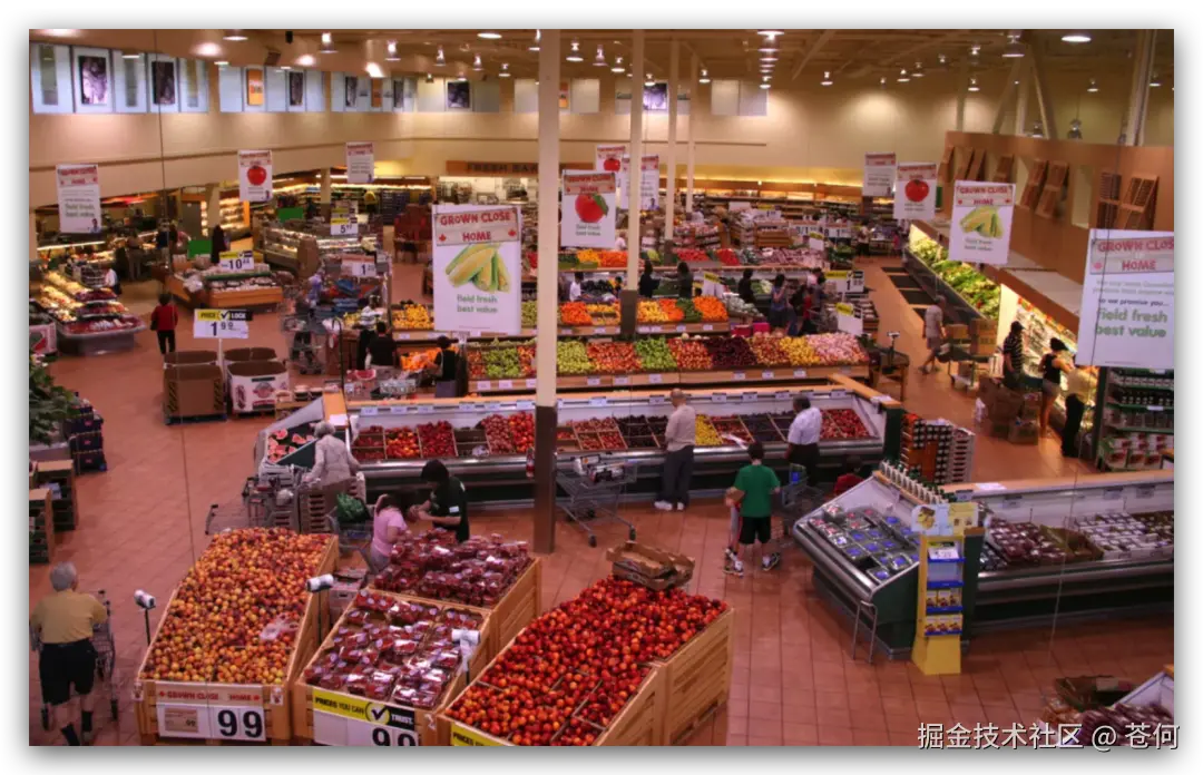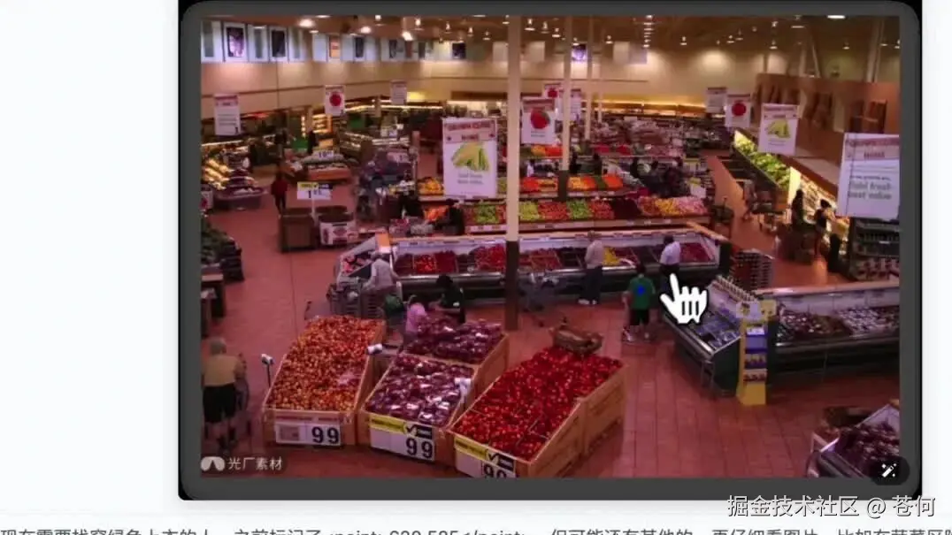 这张超市里的图片(素材来自网络),我想让它帮我找下穿绿色上衣的人。