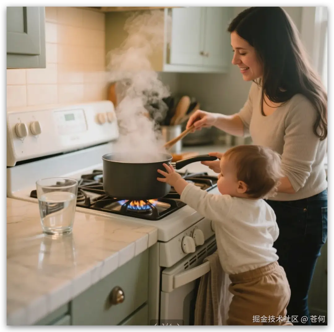 提示词:这张看似平常的家庭照片中,存在哪些潜在的安全隐患?请具体指出危险点,并说明可能导致的后果。以及标注出有隐患的点