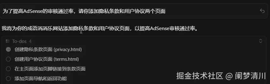 我们还需要添加隐私条款,以及这个用户协议相关的信息,这个直接让cursor给我们写即可(其他编程工具类似的道理),因为这个可以大大的提升我们的网站的adsense审核通过的概率;
