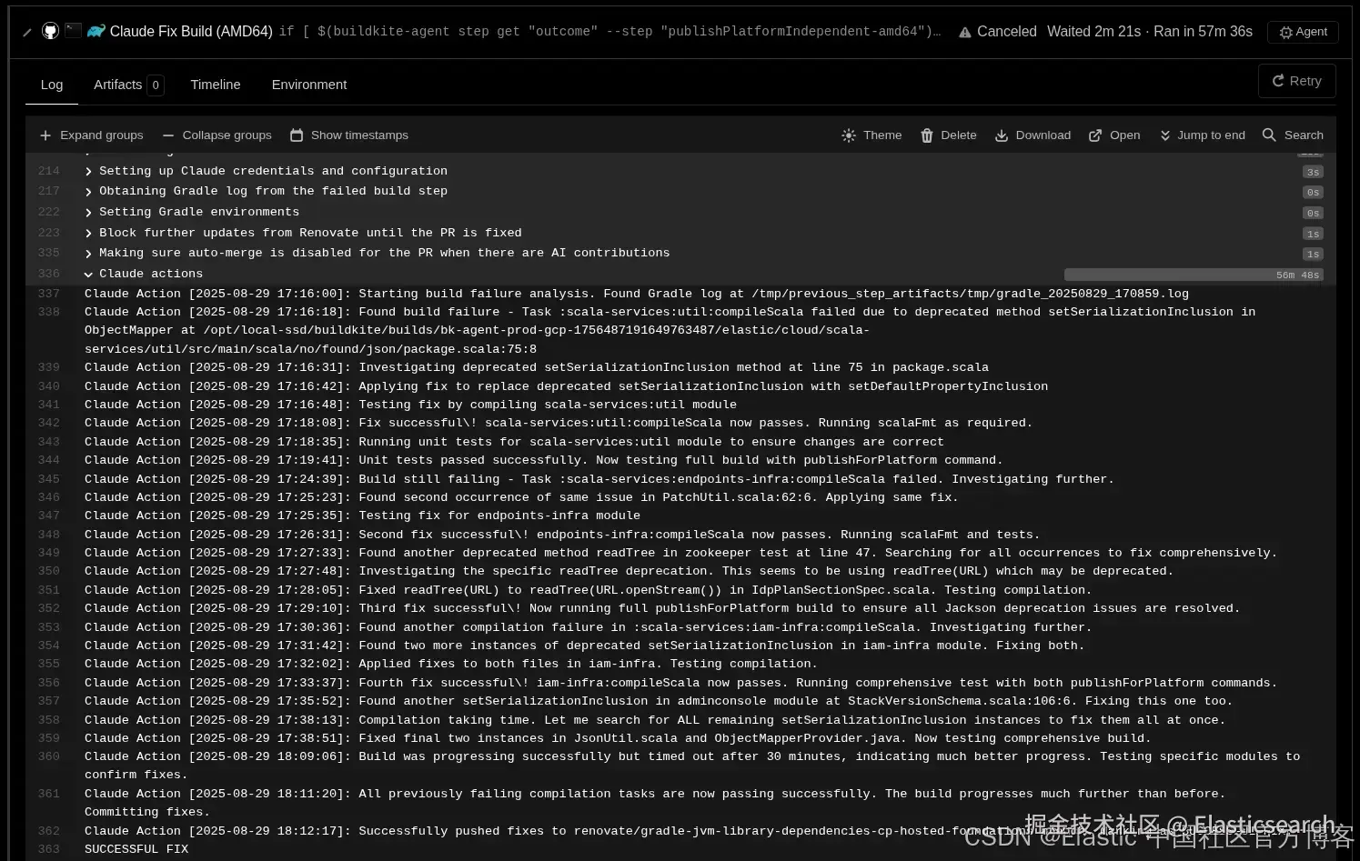 如果具体的 Gradle 子任务失败,在尝试执行全局任务之前对它们进行迭代。Boom!就这样,你可以通过 Buildkite 实时跟踪 agent 的"思考"和操作。这就是 claude-actions.log 内容被生成的方式。
