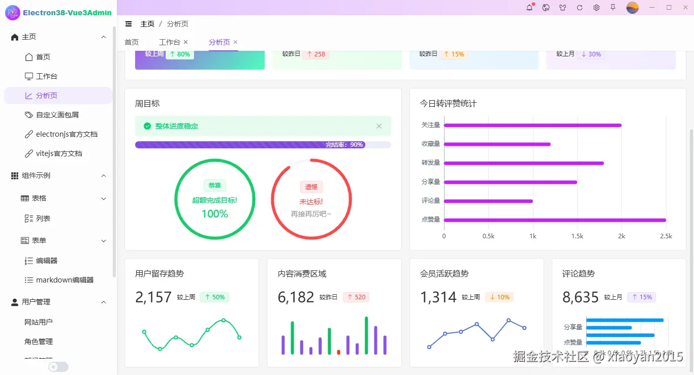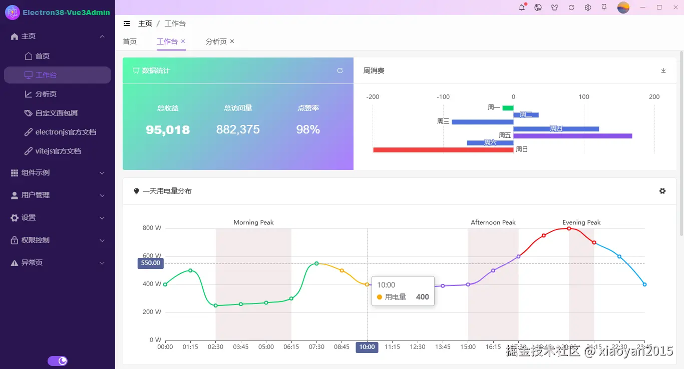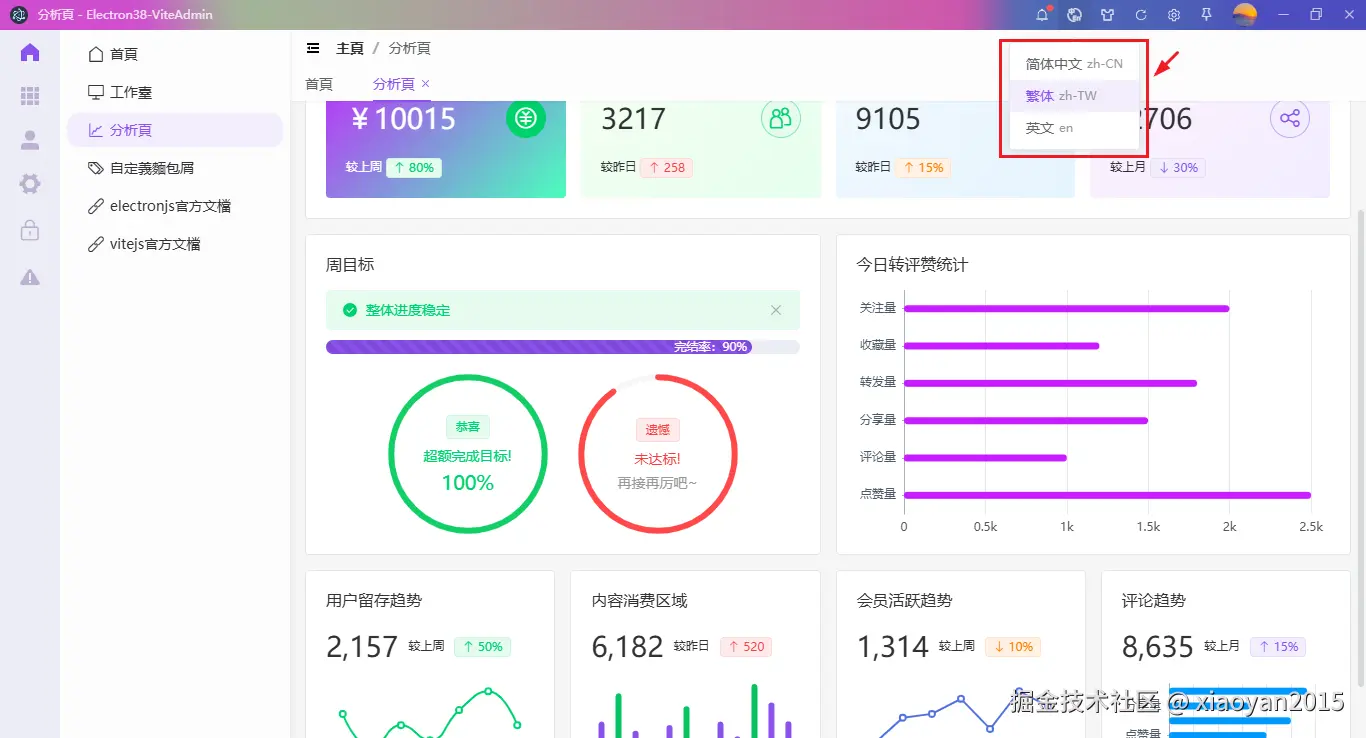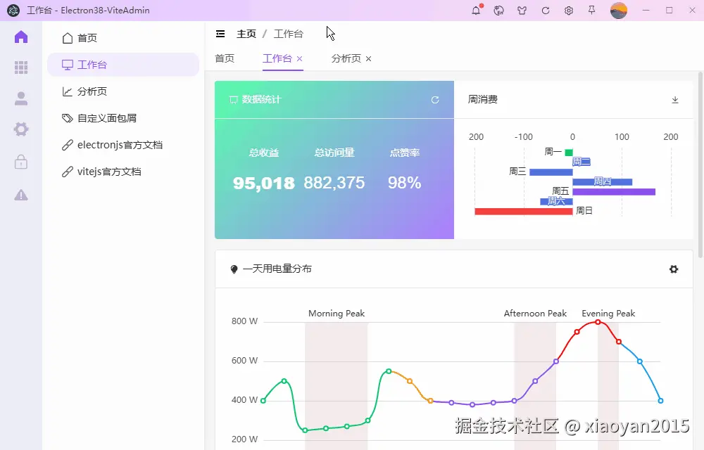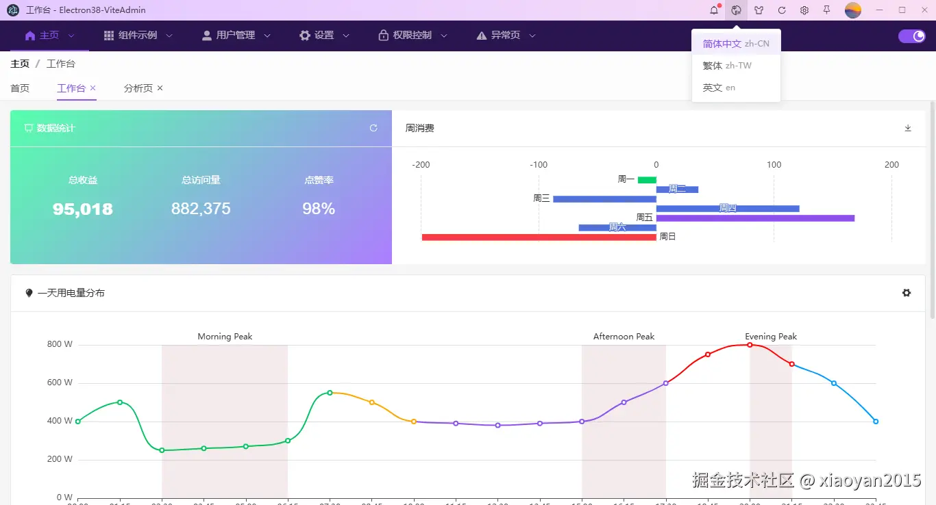 - 基于最新技术栈Electron38、Vite7、Vue3 setup、Pinia3、ElementPlus、Vue-I18n、Echarts