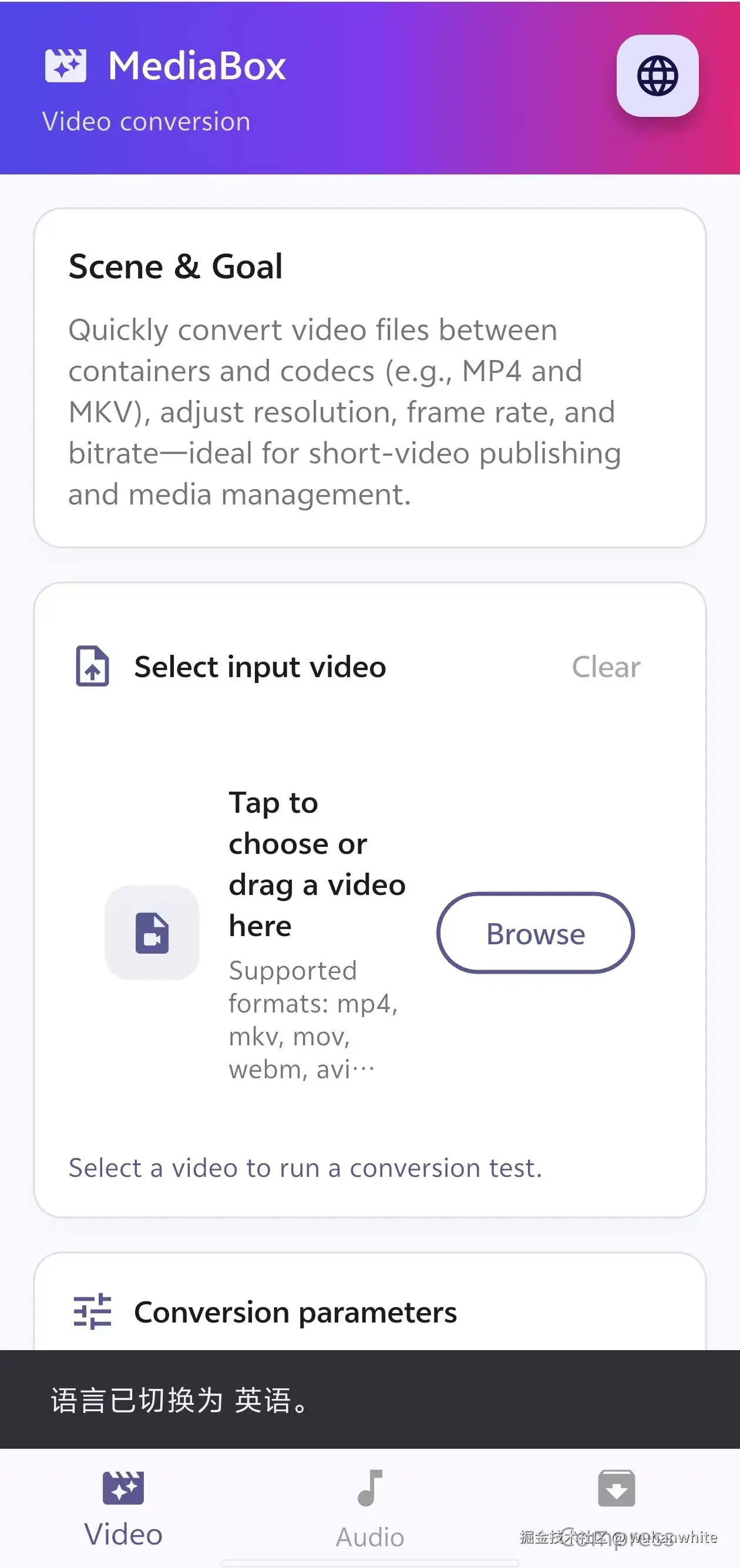 在手机上调试,一切正常。首页的 浏览按钮 能顺利打开相册,右上角的 语言切换功能 也能正常工作。 - 但一旦用命令打包成 release APK(例如