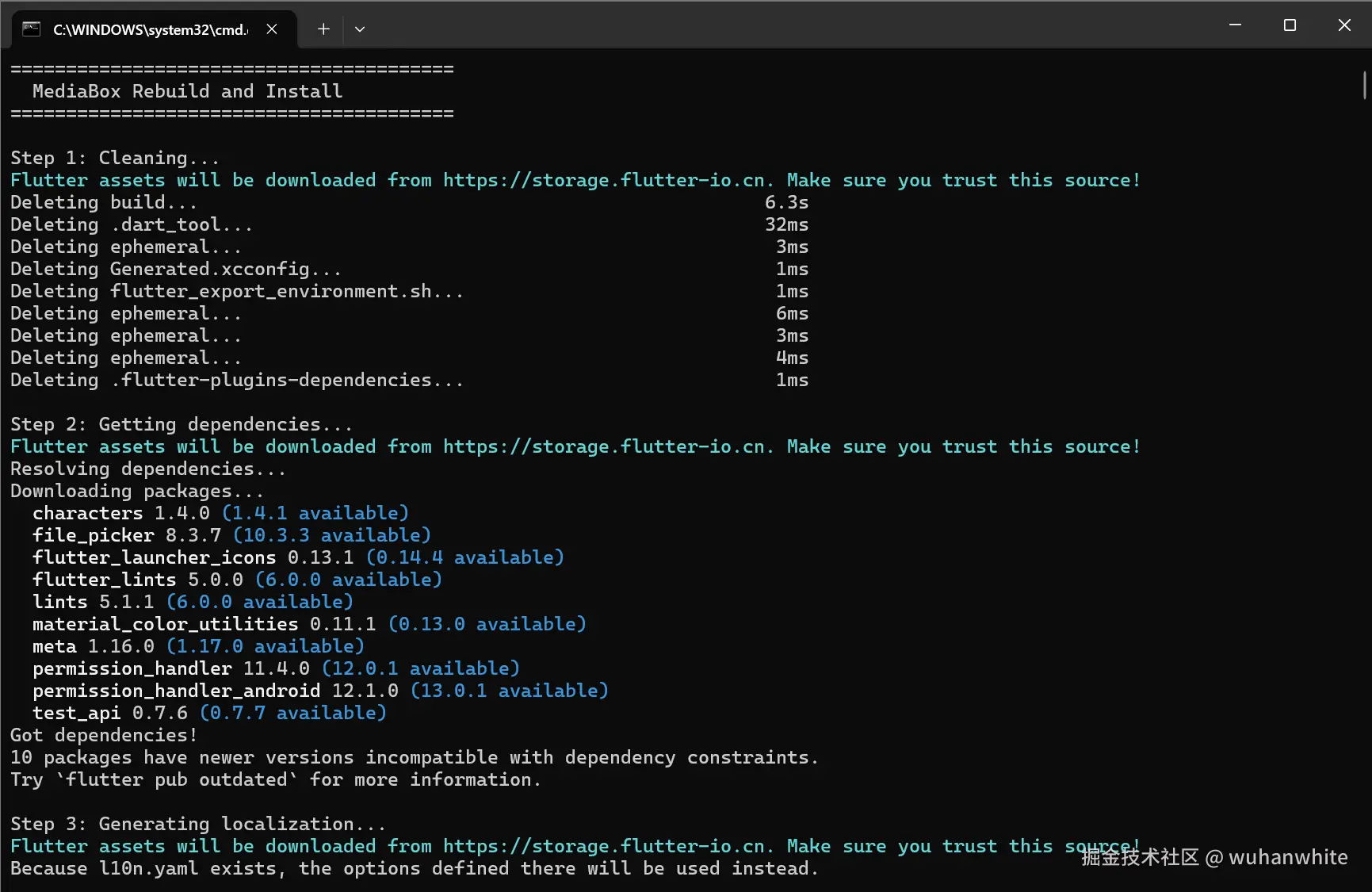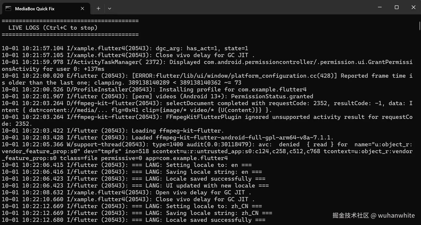 用这个脚本打包并运行,能立刻看到 logcat 里的报错,确认是 MissingPluginException