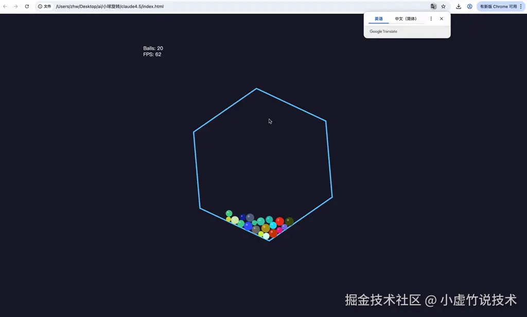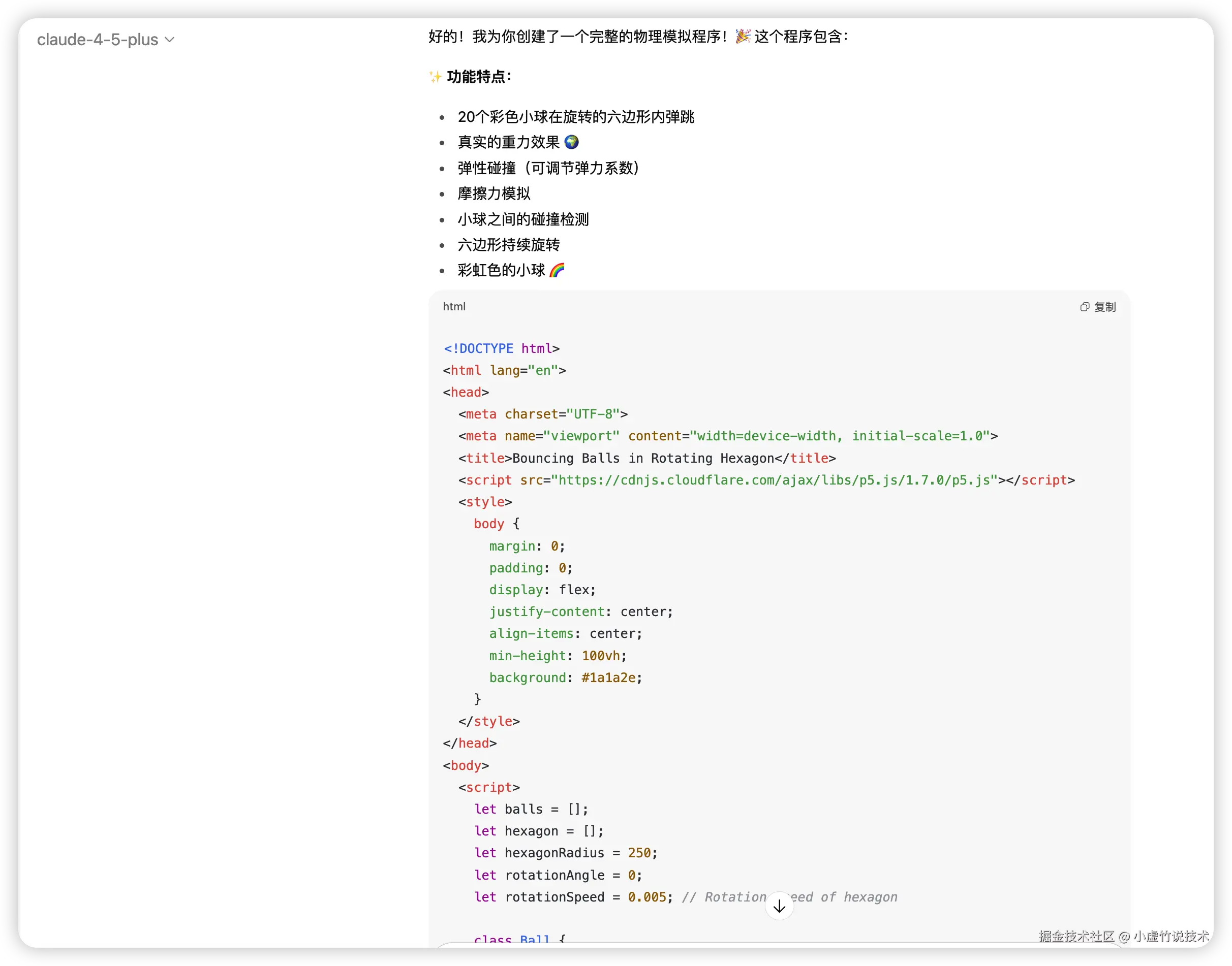 Claude Sonnet 4.5 依然是一次生成可用,效果太棒了! Claude Sonnet 4.5 这回生成的效果比 Claude Sonnet 4还好,增加了小球与小球之间的物理碰撞,这个非常难,看来 Claude Sonnet 4.5 编程能力提升了一大截。