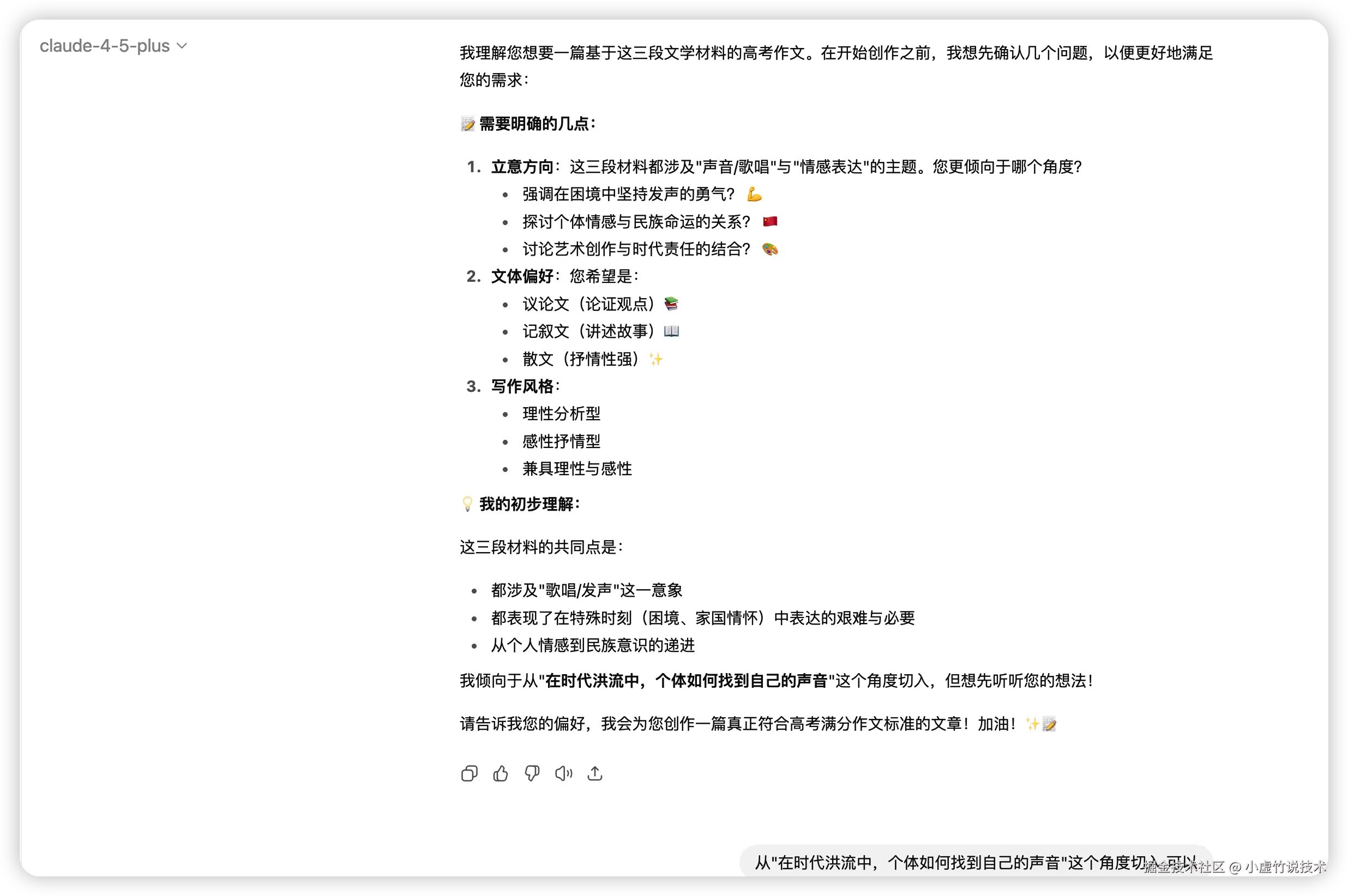 Claude Sonnet 4.5终于学会了"先问后做"------不再自作主张地生成内容,而是会先征询用户意见,按需定制。这种从"直男"到"暖男"的转变,体现了AI在人机交互理解上的巨大进步,让协作变得更加顺畅自然。
