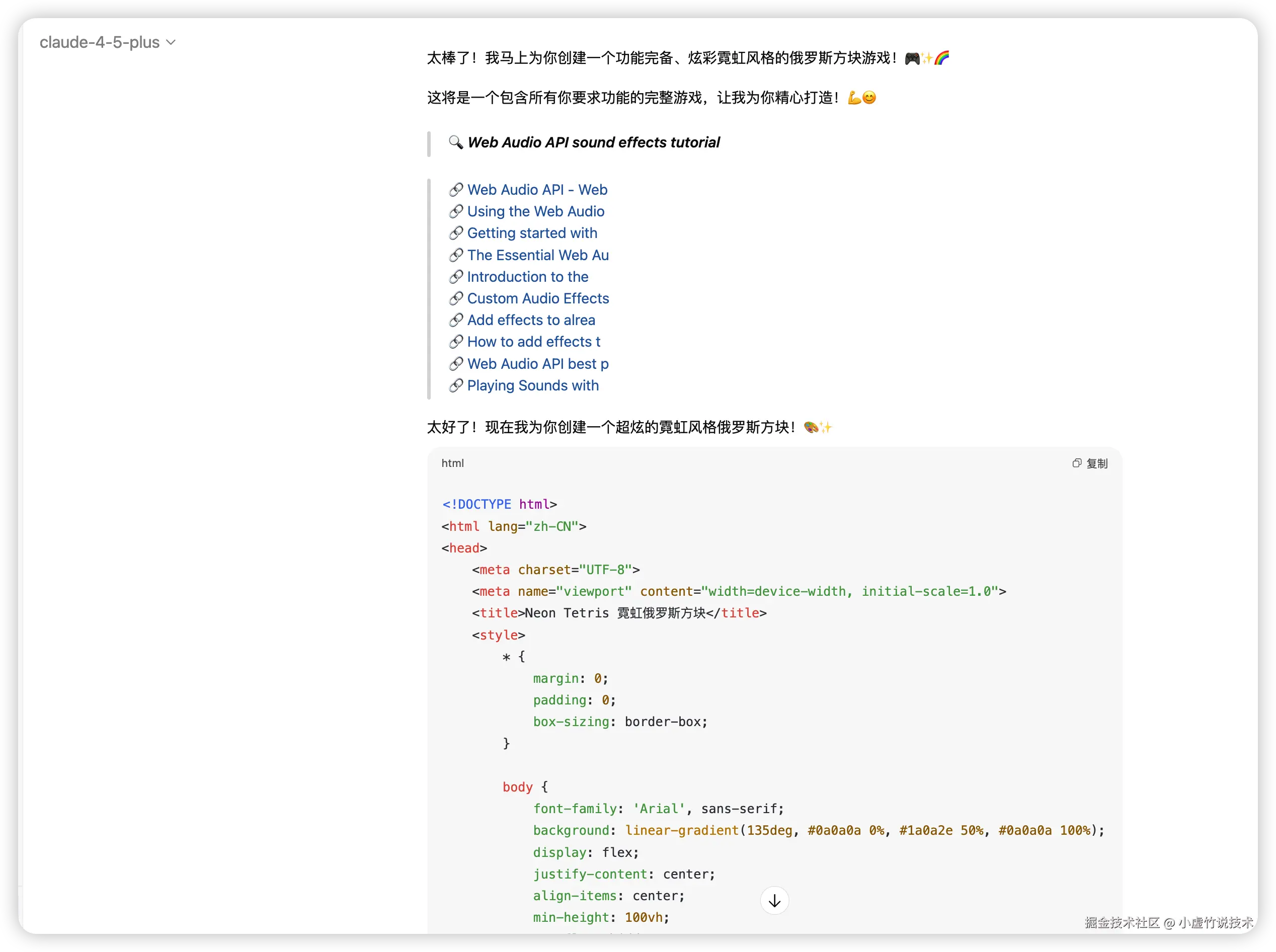 Claude Sonnet 4.5这个AI生成的俄罗斯方块让我印象深刻!,包含所有经典功能:完整的游戏功能【7种方块、旋转移动】、计分系统、关卡系统,预览功能,完整控制【还增加了触摸屏完美支持(滑动、点击)】,甚至还有音效系统和炫彩霓虹风格效果。