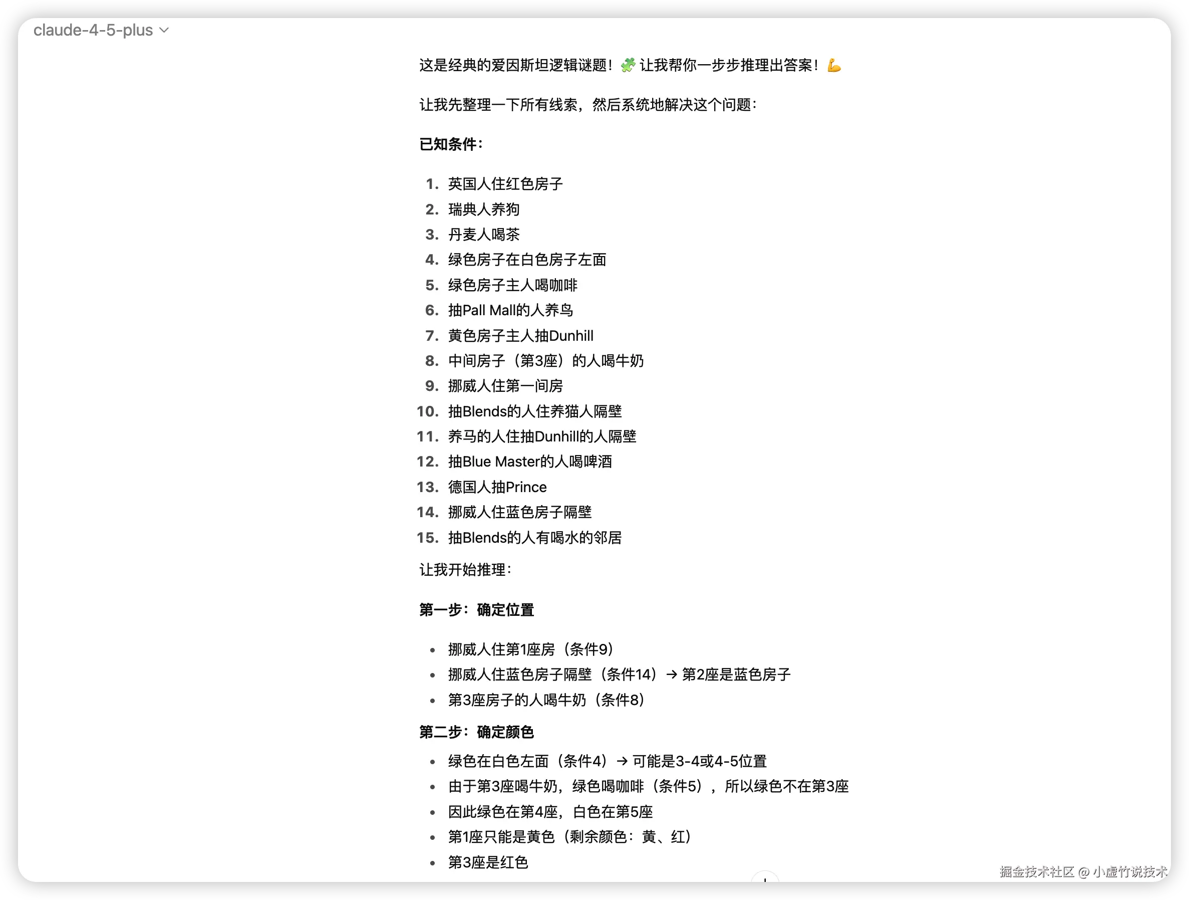 本次测评推理过河难题和经典的爱因斯坦斑马难题(谁养鱼),深入地考察了 Claude Sonnet 4.5 的逻辑推理与思维能力。结果表明,Claude Sonnet 4.5 具备高度发达的、类似人类的推理智慧。