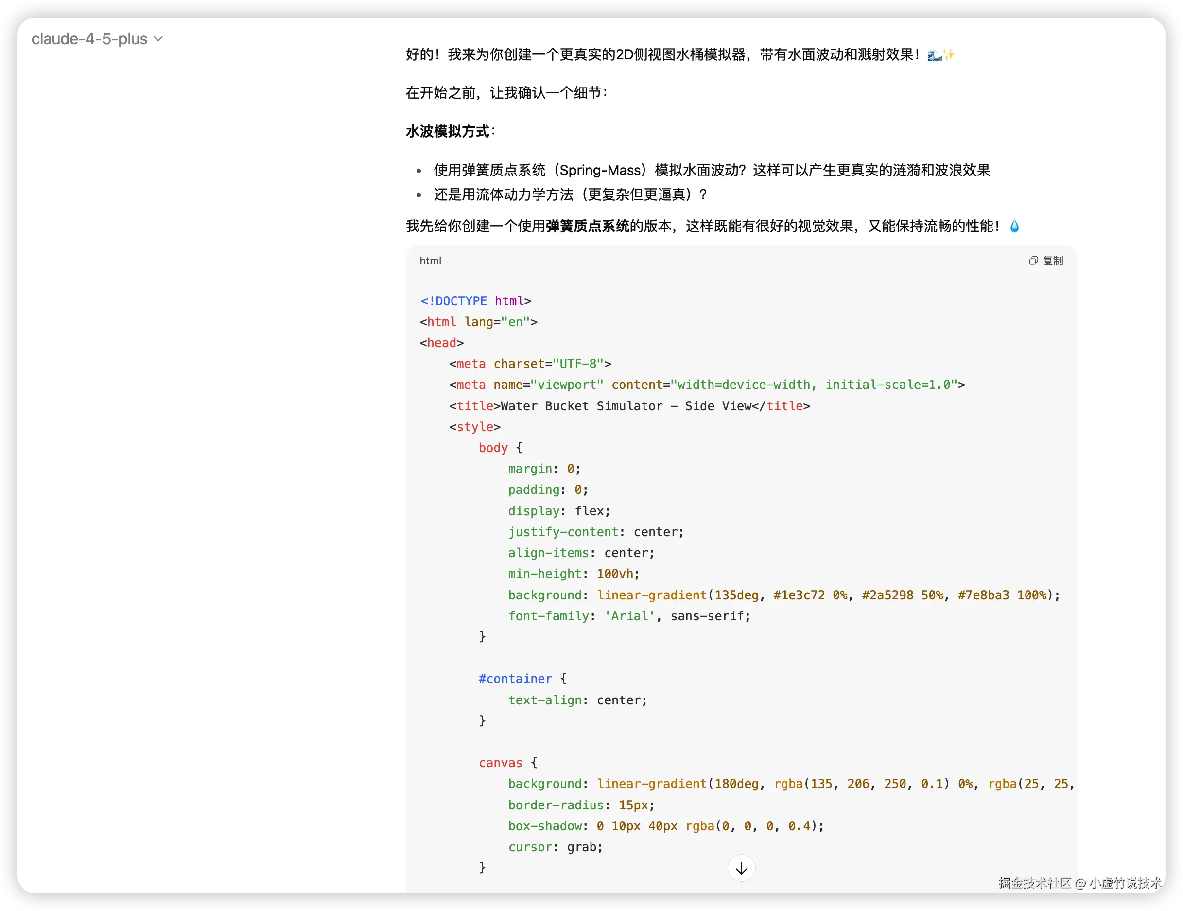 claude4的ai编程能力是真的强!遥遥领先! 视觉效果升级:玻璃水桶侧视图 - 透明玻璃材质,可以清楚看到水的运动;真实水面波动 - 使用弹簧质点系统,水面会产生逼真的涟漪和波浪。 物理模拟增强:波浪传播 - 扰动会在水面传播开来;溅射粒子 - 水溢出或受到冲击时会产生水花。