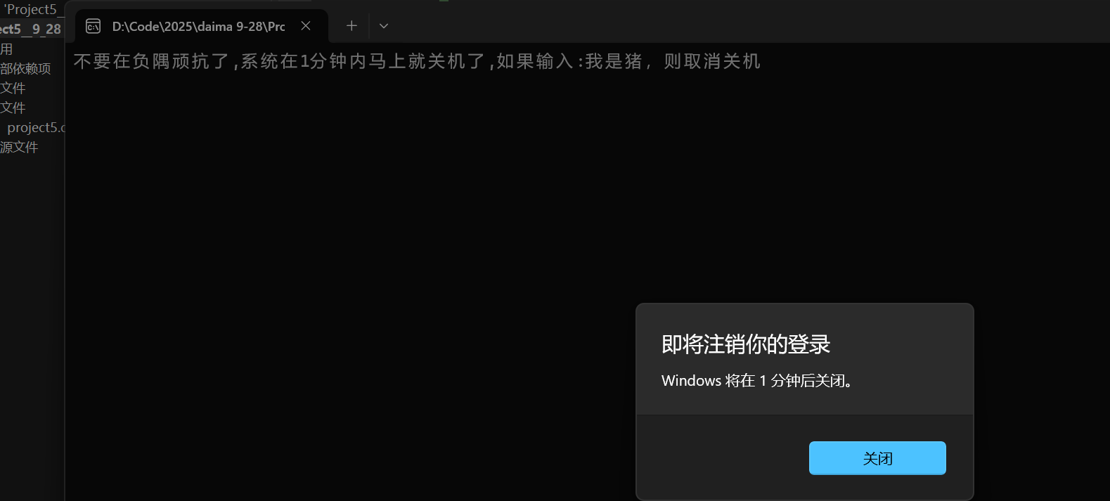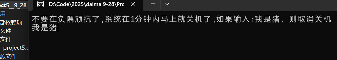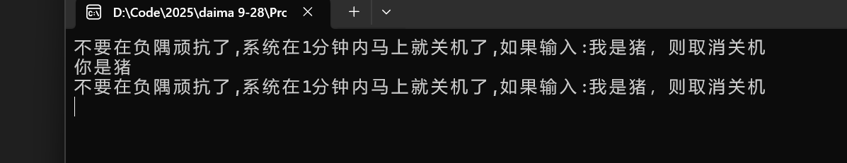 printf("不要在负隅顽抗了,系统在1分钟内马上就关机了,如果输入:我是猪,则取消关机\n");
