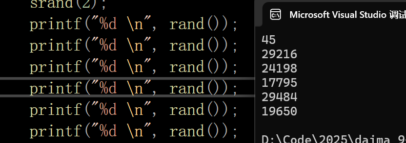 输出结果如下,我们发现这里的数字明显和上面的不一样了,所以总的来说,srand其实就是将生成器(种子)进行了变化,所以我们的输出值也会跟着变化