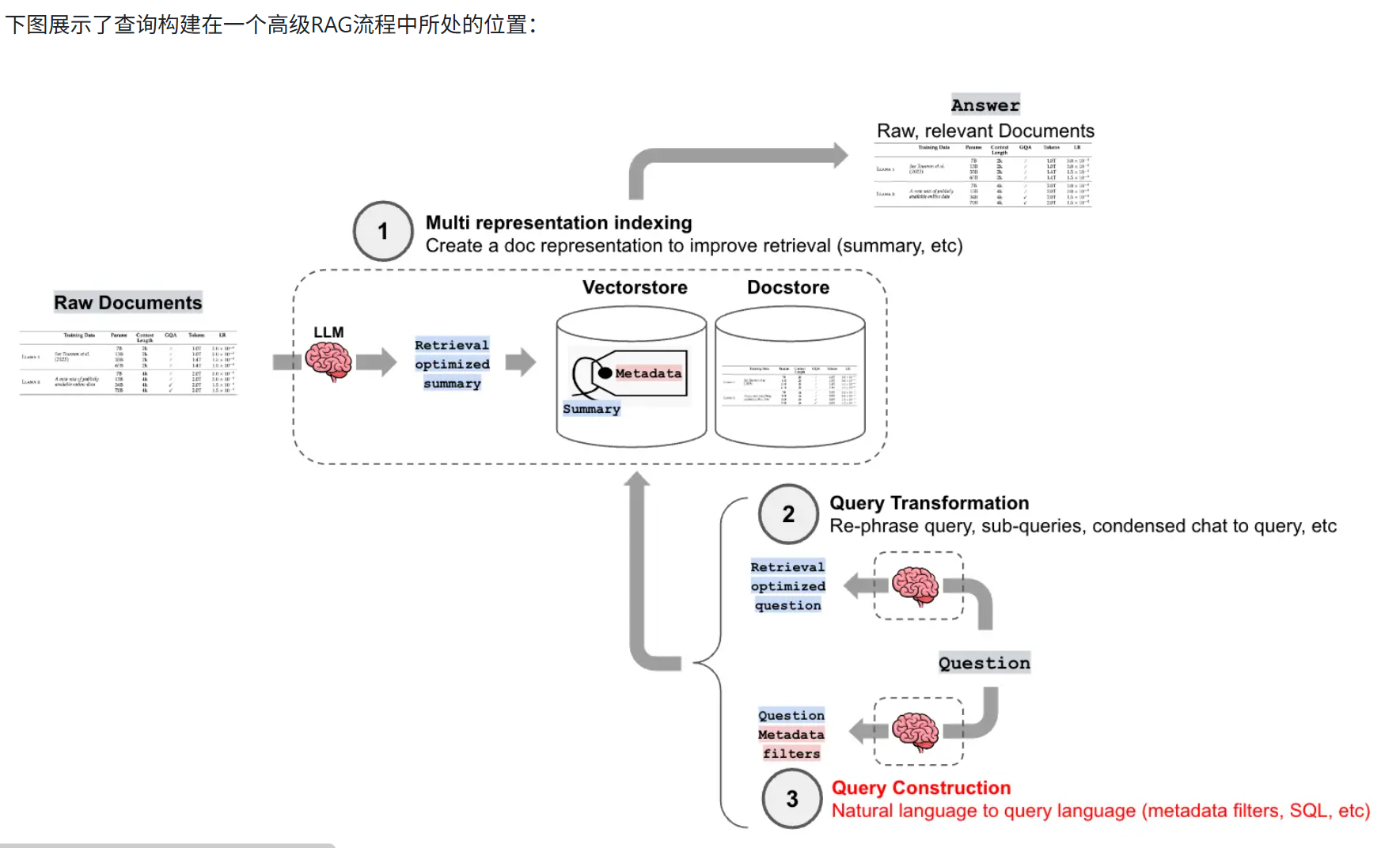下面是查询索引在RAG中的位置,可以看到,查询构建在向量化嵌入这一步,他完成的正是文本和数据库之间的沟通桥梁这个作用。