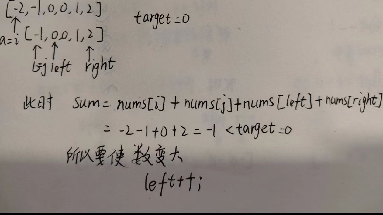 2.在a后面的区间内利用"三数之和"找到三个数,使这三个数等于target-a即可,而"三数之和"过程就是依次固定一个数b;在b后面的区间内,利用"双指针"找到两个数,使这两个数的和等于target-a-b即可.