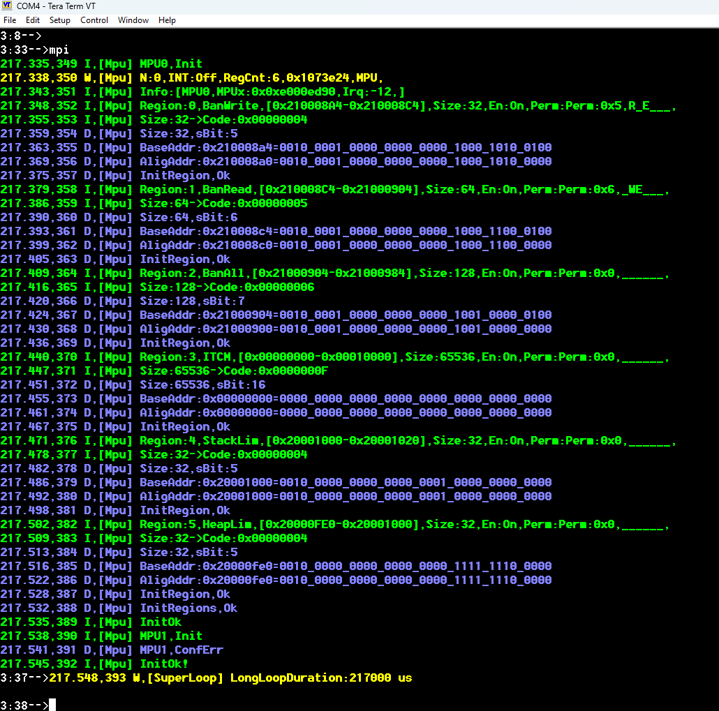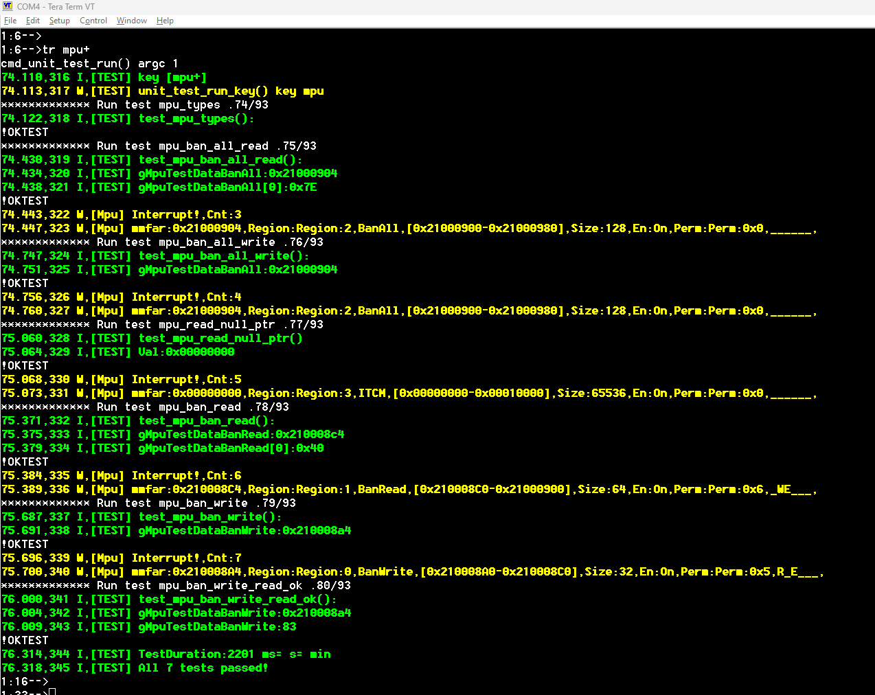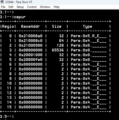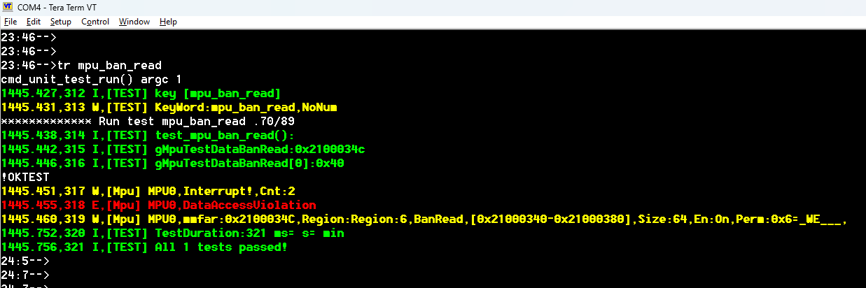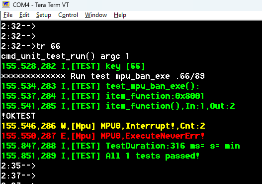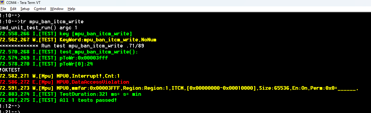 为了检查是否禁止写入 ICTM 内存,我使用了 test_mpu_ban_itcm_write 测试。shell 命令 tr mpu_ban_itcm_write 显示,尝试写入 ITCM 确实会触发 MemManage_Handler 中断。