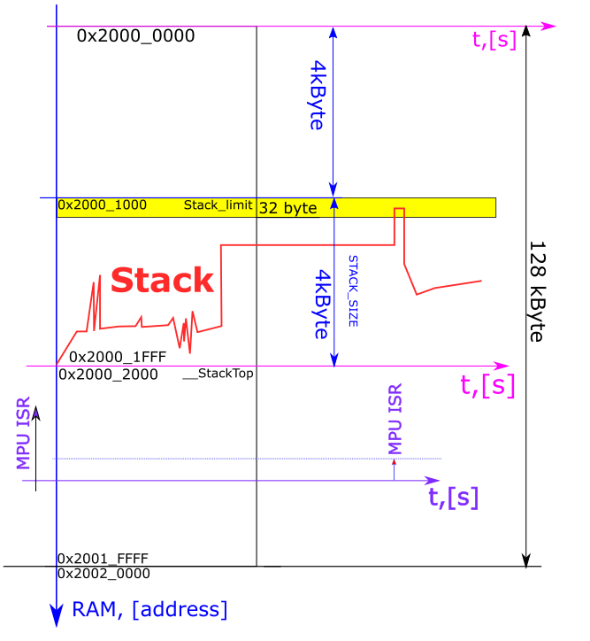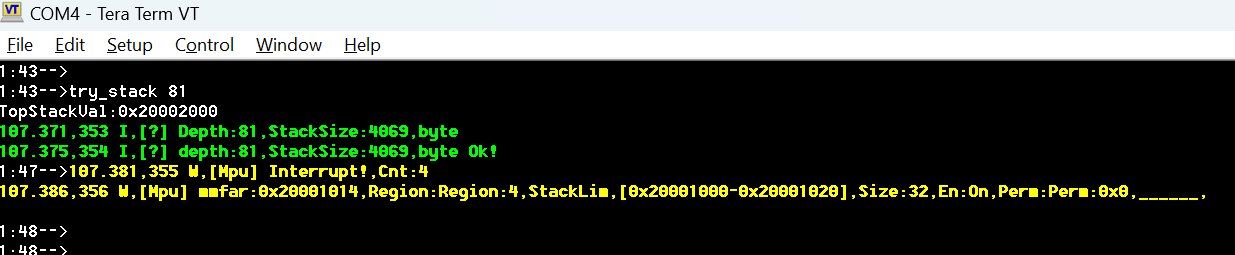 当max_depth值足够高时,堆栈帧开始与堆栈下方的 MPU 区域重叠。实际情况就是这样。实际上,我在 LD 脚本中为堆栈指定了 4k 字节。一切都匹配。