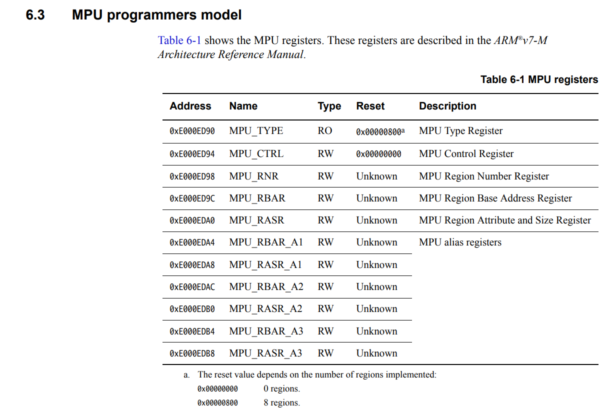 在物理内存中,MPU 寄存器位于地址0xE000_ED90。MPU 寄存器列表可在ARM Cortex-M7 处理器技术参考手册中找到。