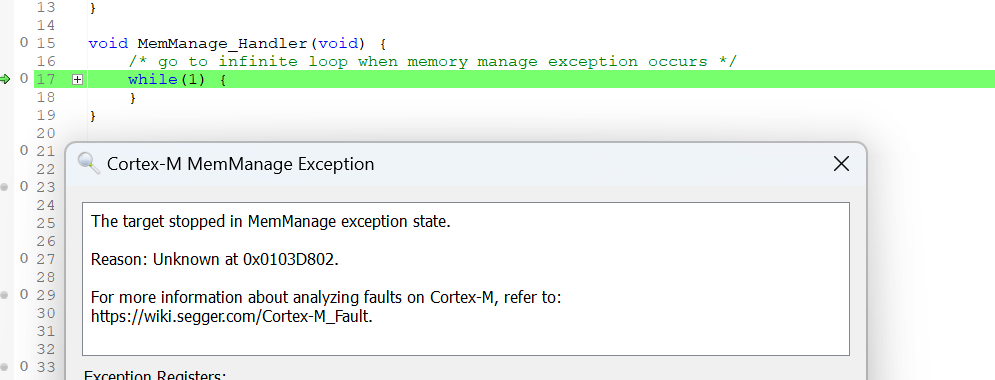 实验表明,MPU 不会禁止执行来自受限区域的代码。MPU 只是通知 MemManage_Handler 中断即将发生访问冲突 **。**但是,一旦 MPU 在中断中被禁用,代码本身在退出 MemManage_Handler 后就会继续不受干扰地执行。