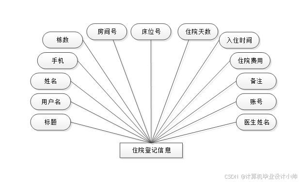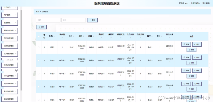 住院登记管理,在住院登记管理页面可以查看标题、用户名、姓名、手机、栋数、房间号、床位号、住院天数、入住时间、住院费用、备注、账号、医生姓名等内容,并且根据需要进行详情、修改或删除等操作,如图所示。