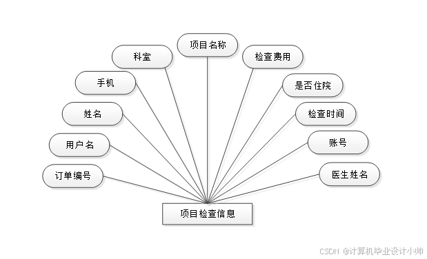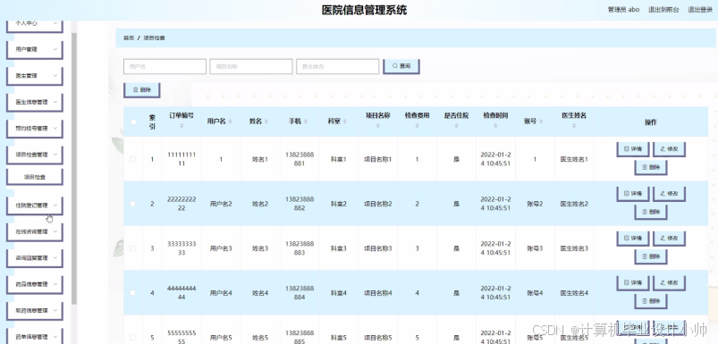 项目检查管理,在项目检查管理页面可以查看订单编号、用户名、姓名、手机、科室、项目名称、检查费用、是否住院、检查时间、账号、医生姓名等内容,并且根据需要进行详情、修改或删除等操作,如图所示。