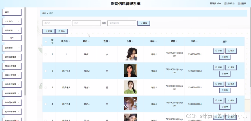 用户管理,在用户管理页面可以查看用户名、姓名、性别、头像、年龄、邮箱、手机等信息,并可根据需要进行详情、修改或删除等操作,如图所示。