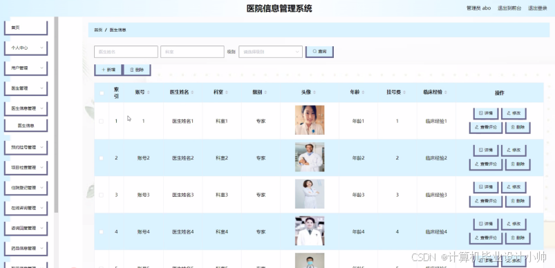 医生信息管理,在医生信息管理页面可以查看账号、医生姓名、科室、级别、头像、年龄、挂号费、临床经验等内容,并且根据需要进行详情、修改、查看评论或删除等操作,如图所示。