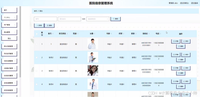医生管理,在医生管理页面可以查看账号、医生姓名、性别、头像、年龄、科室、职称、身份证、电话等信息,并可根据需要进行详情、修改或删除等操作,如图所示。