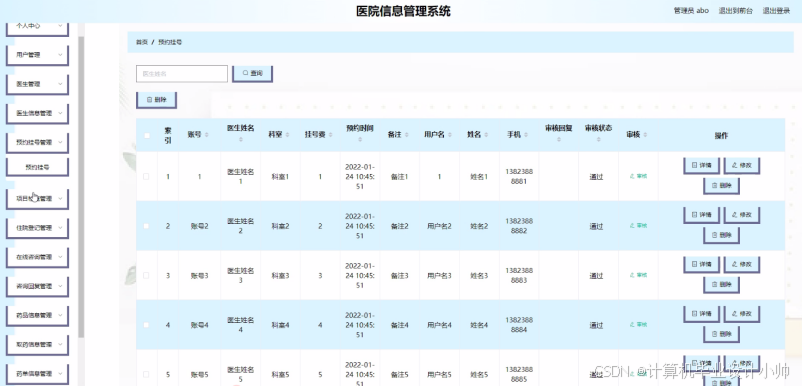 预约挂号管理,在预约挂号管理页面可以查看账号、医生姓名、科室、挂号费、预约时间、备注、用户名、姓名、手机、审核回复、审核状态、审核等内容,并且根据需要进行详情、修改或删除等操作,如图所示。