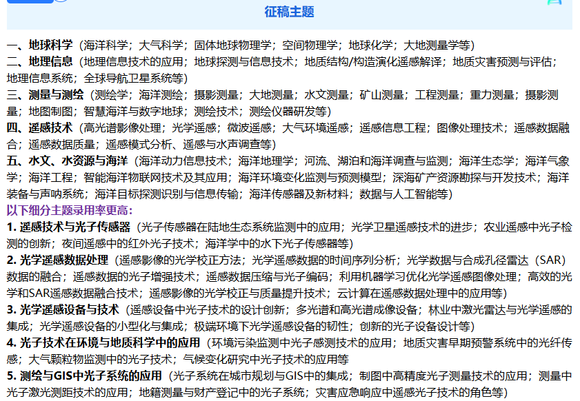 - 遥感:测绘、导航与倾斜摄影等相关的理论、技术与方法,遥感(RS),光学遥感,微波遥感,大气环境遥感,行星遥感与测图,冰冻圈与水圈,地理信息科学,遥感信息工程,空间数据库,地球监测与制图,空间技术与景观,分类和数据挖掘技术,图像处理技术,高光谱影像处理,遥感数据融合,遥感数据质量,遥感模式分析;