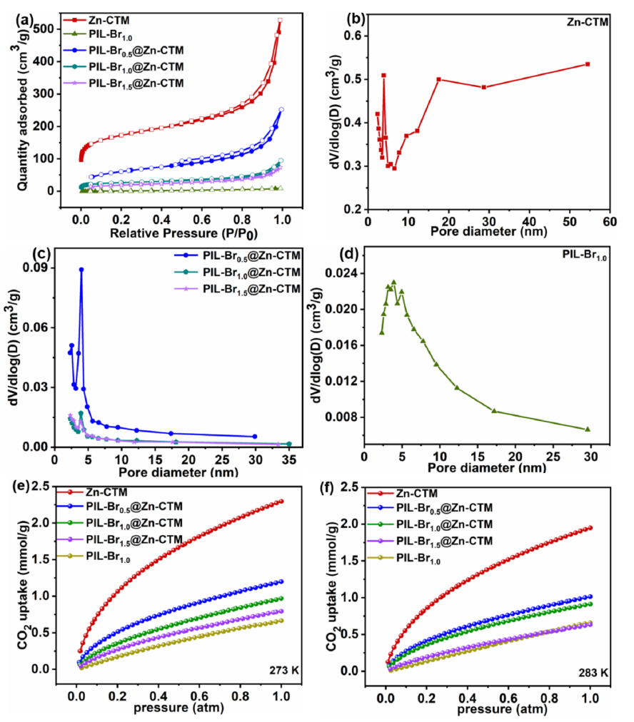 在多相催化中,催化剂的比表面积、孔径分布及孔体积等织构性质对其吸附性能、活性位点可及性以及传质效率具有决定性影响。在该研究中,作者对Zn-CTM、PIL-Br₁.₀以及系列PIL-Brₓ@Zn-CTM复合材料进行了系统的N₂吸附-脱附测试,以揭示其多孔结构特性。