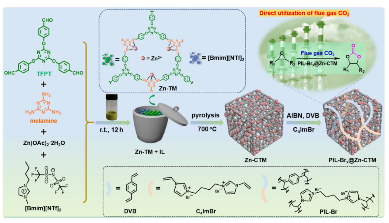 青岛科技大学刘猛帅教授团队在《Chemical Engineering Journal》上 发表了题为"Capture and in-situ conversion of low-concentration CO 2 over robust poly(ionic liquid)@porous carbon nanocomposites under green, co-catalyst-and solvent-free conditions"研究论文,报道了一种聚离子液体@多孔碳纳米复合材料(PIL-Brₓ@Zn-CTM),该材料在无溶剂、无助催化剂的温和条件下,实现了对低浓度CO₂的高效捕获与原位转化生成环状碳酸酯,为碳资源的高值化利用提供了新策略。