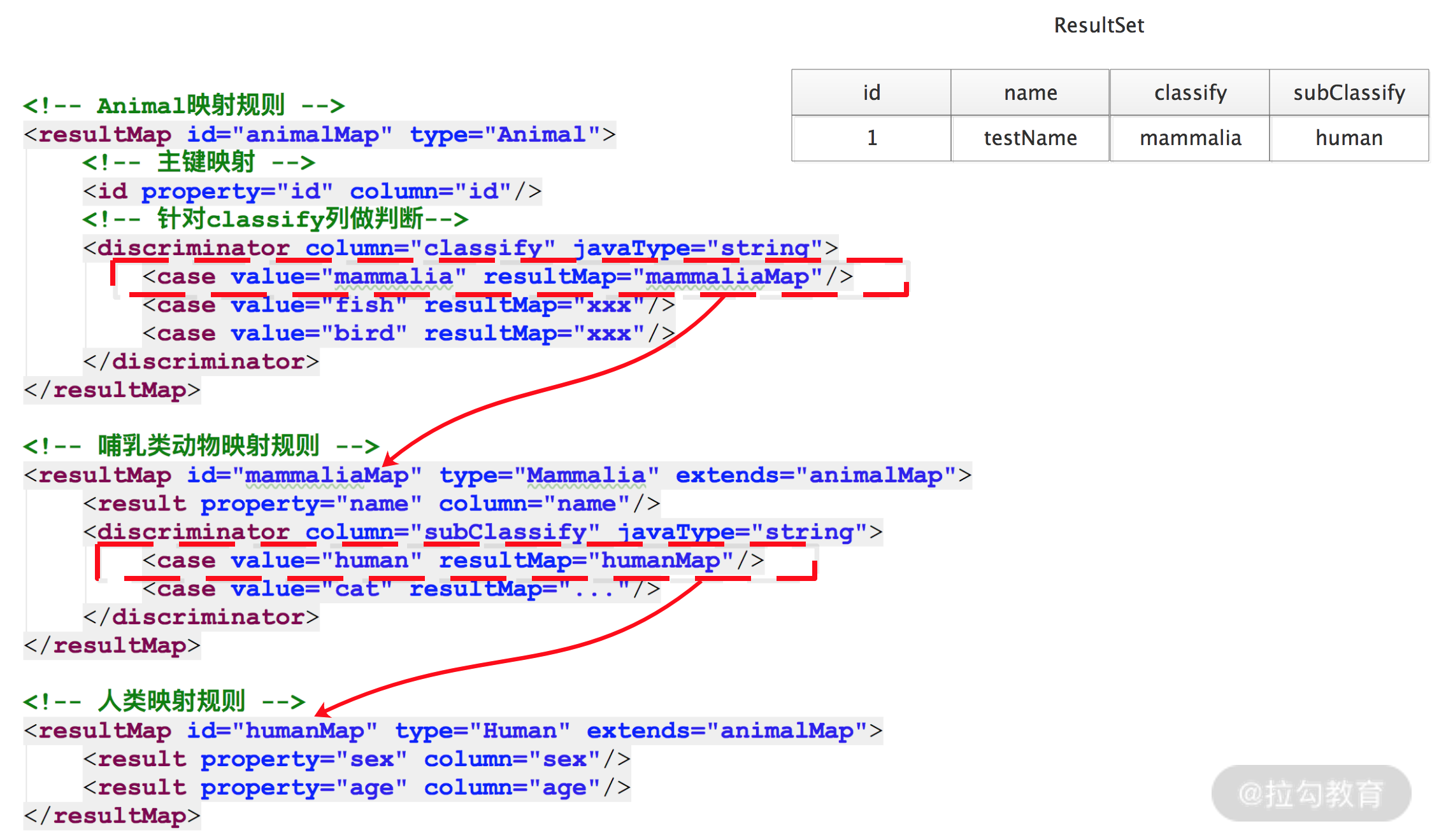 - 首先按照 animalMap 这个 ResultMap 映射这行记录,该行记录中的 classify 列值为 mammalia,根据其中定义的