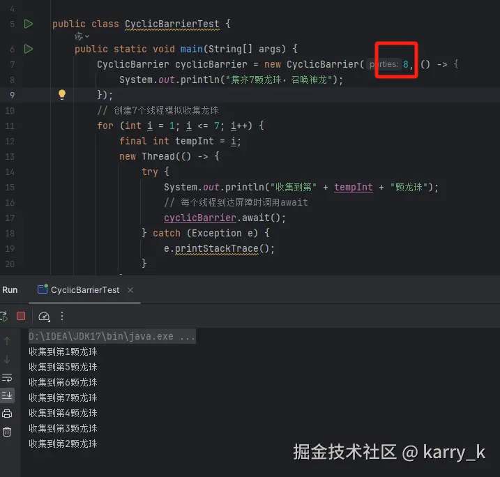 CyclicBarrier cyclicBarrier = new CyclicBarrier(7, () -> {