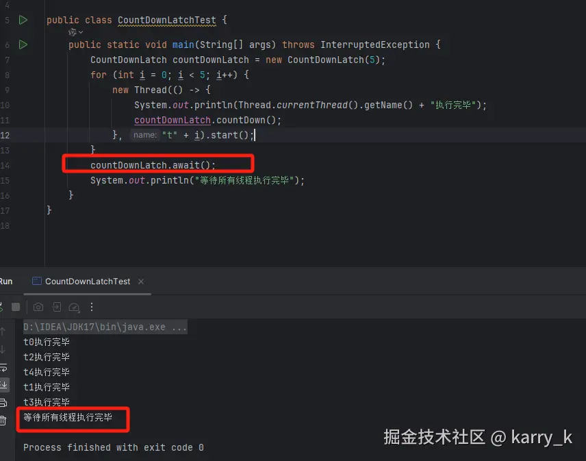 总之就是在某些场景下,必须等待一些线程完成后才能继续进行就可以使用这个 CountDownLatch