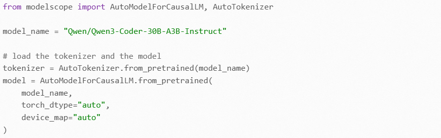 从ModelScope开源社区的大模型库,下载阿里云Qwen3-Coder编程大模型到本地开发环境中,导入大模型开发依赖库,初始化分词器以及大模型实例: