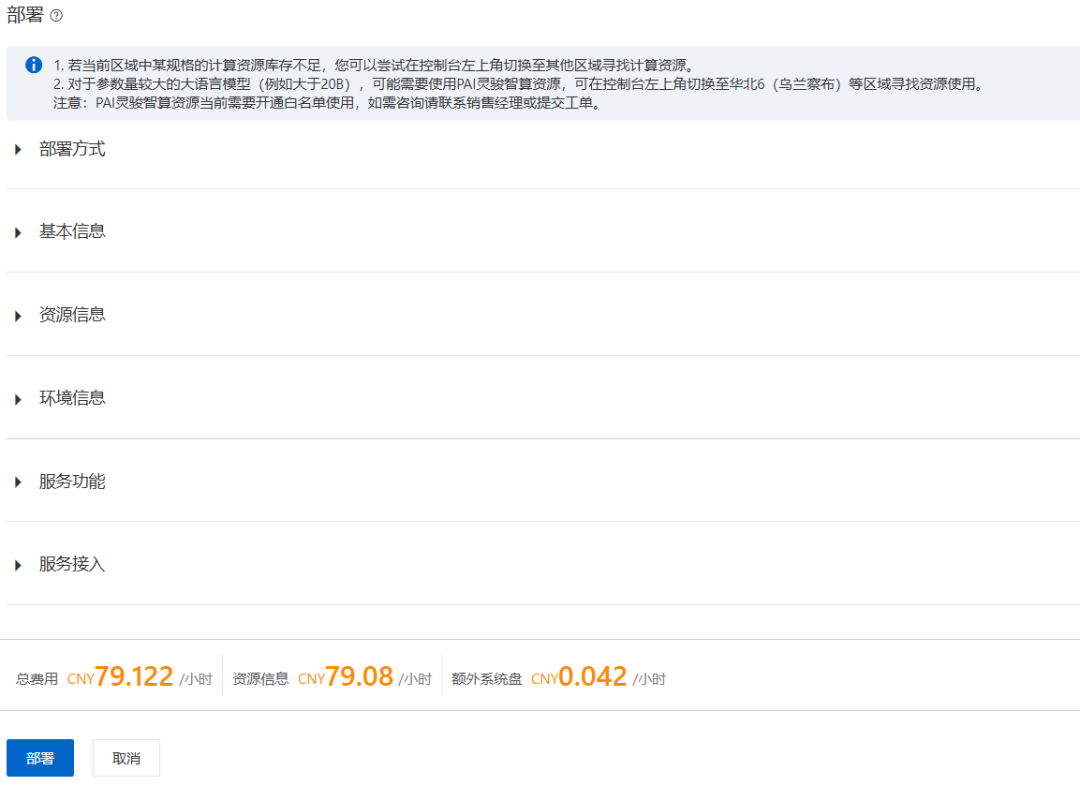 在Qwen3-Coder编程大模型的部署的属性参数设置页面中,设置完成,点击部署按钮,开始执行模型部署: