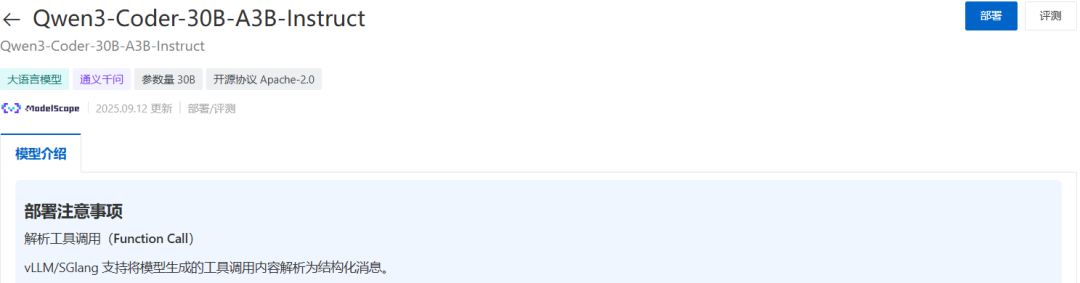 在Qwen3-Coder编程大模型的详情页面中,点击部署按钮,开始设置部署的属性参数: