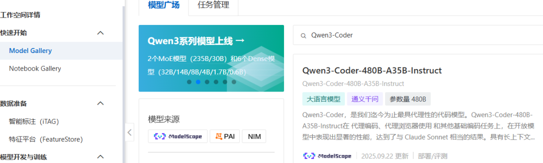 在阿里云人工智能业务平台PAI中,查找对应规格的Qwen3-Coder编程大模型:
