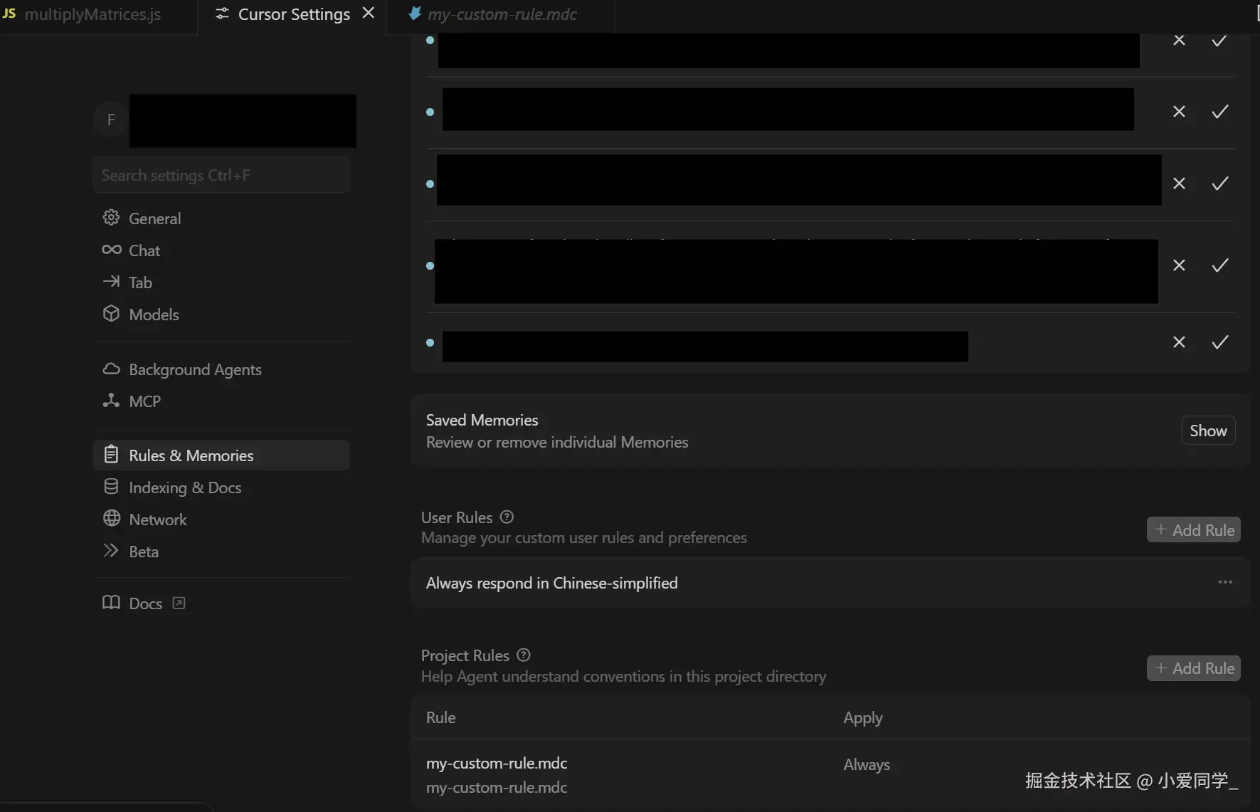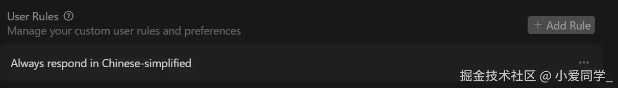 - 在 User Rules 里添加全局规则,或者在 Project Rules 里为单个项目配置
