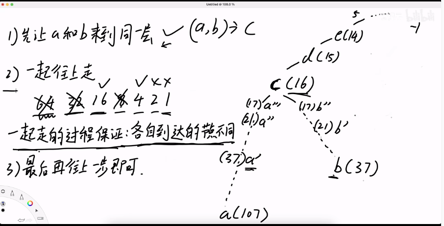查询过程:比如要查询a和b的最近公共祖先,先让深度大的节点走到深度小的节点的深度,就是让a走到第37层,然后同时走64步,发现都到达-1这个节点,所以不要;然后走32步,到达第5层的同一个节点,不要;然后走16步,到达不一样的节点,所以要;以此类推,最后两个节点同时往上走一步就到达了他们的最近公共祖先