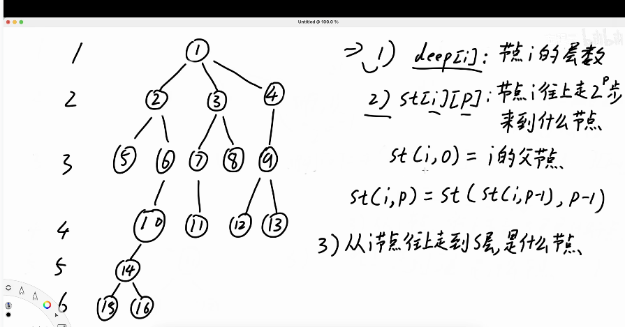 树上倍增: 建立deep和st数组,就可以求出从一个节点往上走s步来到的节点。比如求从16走3步来到的节点,16走3步来到第3层,首先枚举走4步(8步及更多的步数没必要枚举,因为16所在第6层都不足8步),查st表来到2节点,在第2层,所以不要;然后走2步,到第4层的10,所以走到10节点;然后枚举走一步,来到第3层的6节点。