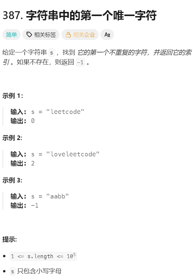 链接如下:https://leetcode-cn.com/problems/first-unique-character-in-a-string