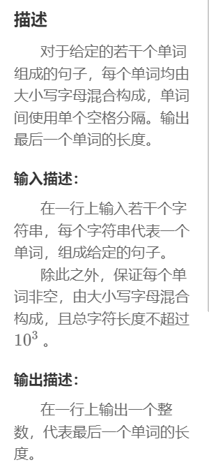 题目意思为:给你一个字符串,去找最后一个单词的长度,相当于需要你去寻找空格。这道题目是一个标准的IO型题目,不是接口型题目。