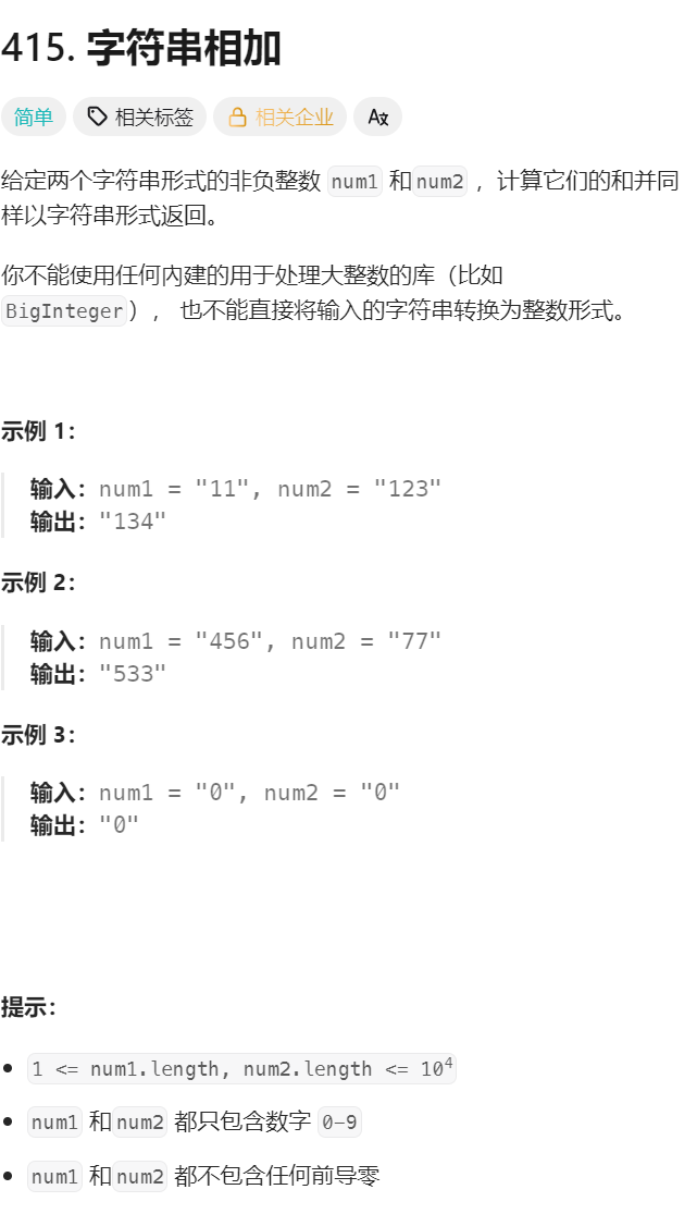 链接如下:https://leetcode-cn.com/problems/add-strings