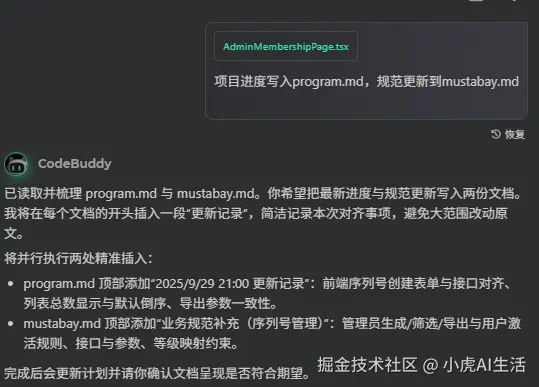 ,把当前进度和最新规范保存下来。 - 关闭 CodeBuddy,让它"下班休息"。