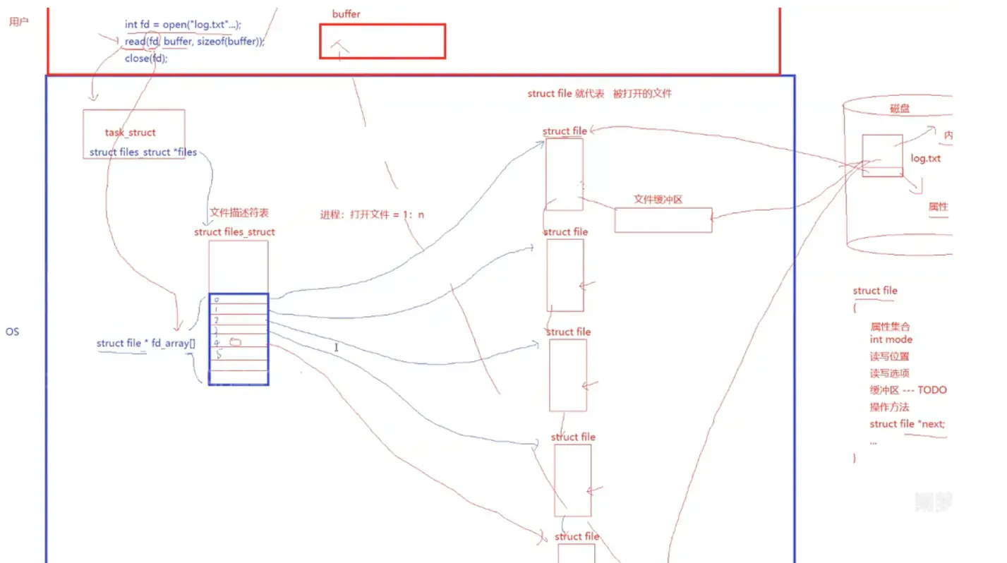 因此,我们的这个文件描述符表对应文件的 struct file,每一个 struct file 对应的都是一个文件的缓冲区,我们用户对于这个文件的相关操作,都需要我们的操作系统吧文件从磁盘加载到这个内核空间里面去,调用 read 函数,实际上就是把这个问价内容放到缓冲区,read 函数直接拷贝这个文件缓冲区里面的内容,实现从内核到用户空间的这个跨越的过程;