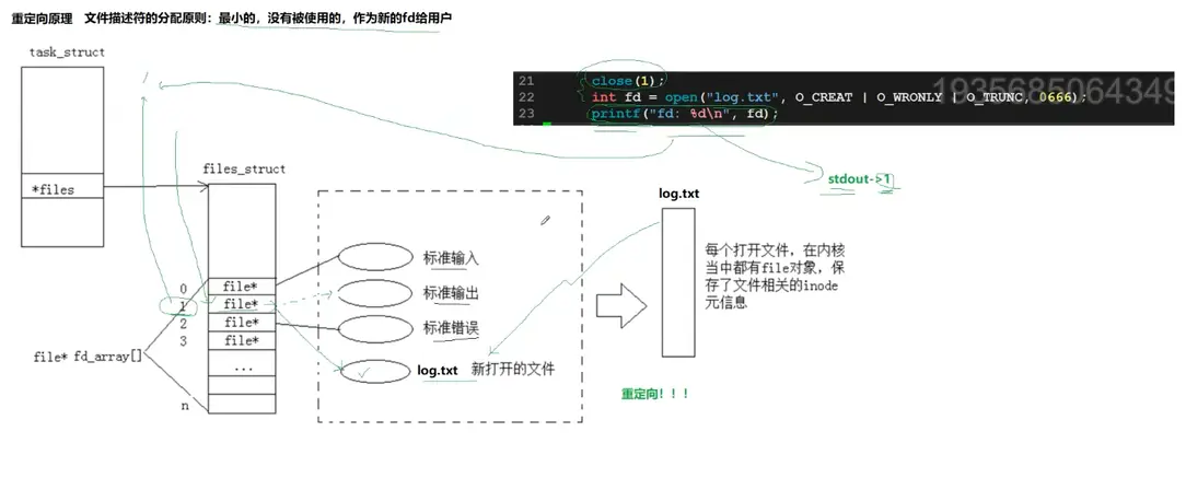 重定向的基本原理就是需要满足我们的文件描述符的相关的分配的规则:最小的,没有被使用的文件描述符才会分配给我们的用户;