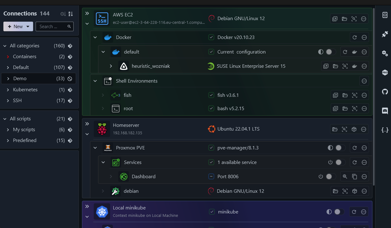 XPipe是一种新型的shell连接集线器和远程文件管理器,它允许您从本地机器访问整个服务器基础结构。它在已安装的命令行程序之上工作,不需要在远程系统上进行任何设置。因此,如果您通常使用ssh、docker、kubectl等CLI工具来连接服务器,则可以在此基础上使用XPipe。