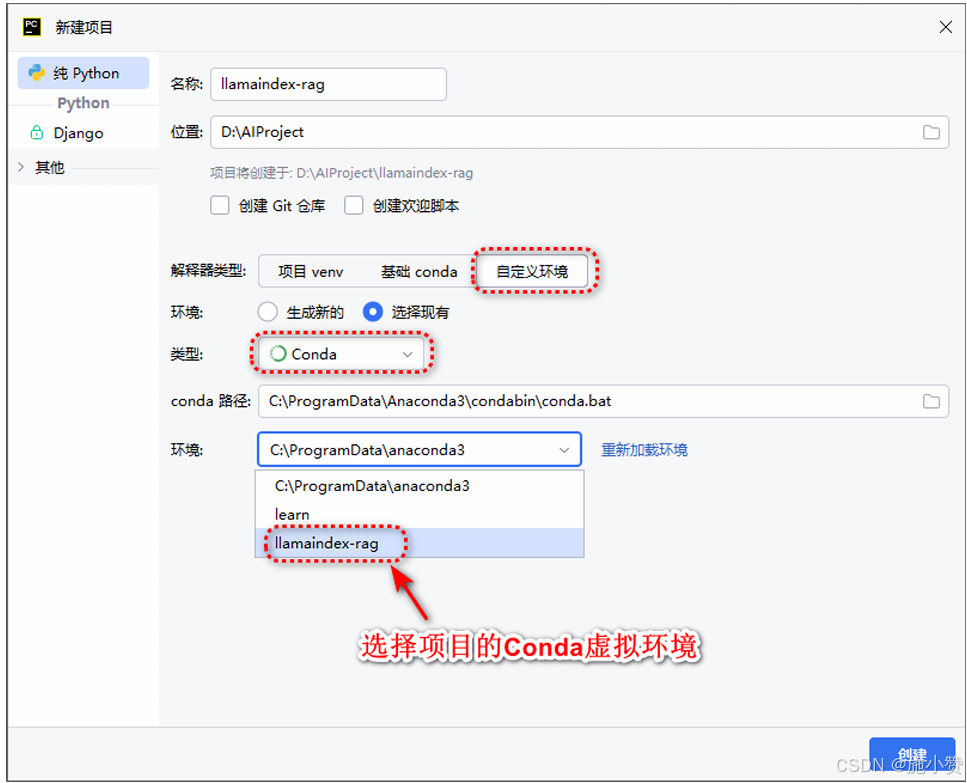 创建项目,选择 自定义环境,类型选择 Conda, 环境选择 llamaindex-rag,点击 创建 即可