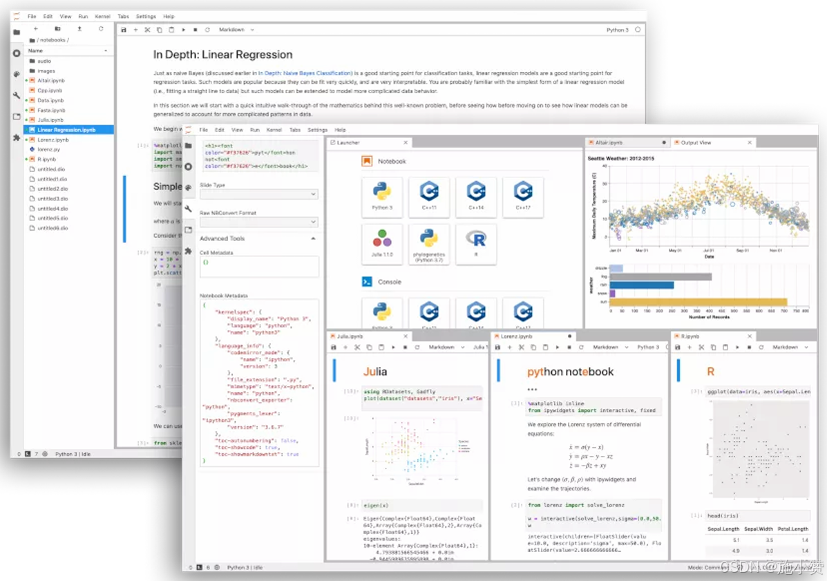 JupyterLab 是最新的基于 Web 的交互式开发环境, 适用于 notebooks、代码和数据。其灵活的界面允许用户配置和安排数据科学、科学计算、计算新闻和机器学习中的工作流程。模块化设计允许扩展来扩展和丰富功能。