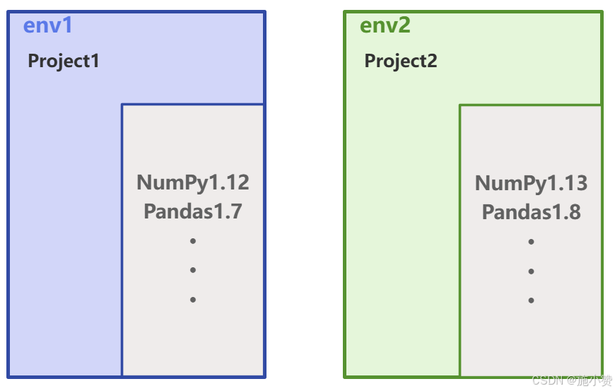 比如,我们有两个项目P1和P2,P1使用NumPy 1.2版本,而P2需要NumPy 1.3版本,一个环境中存在两个版本就可能导致冲突。解决这个问题的办法就是使用虚拟环境。我们可以为每个项目分别创建一个独立的虚拟环境,来隔离包冲突。